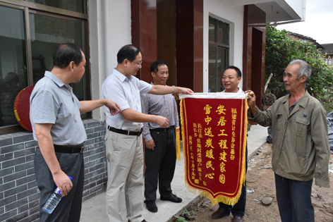 省计生协会专职副会长、省卫计委党组成员陈友茂(左二)在长汀县铁长乡调研时,安居工程受助户陈志东在新房前送上锦旗