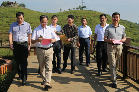 中国计生协会生育关怀基金管委会副主任李晓玉(右一)在我省计生协会专职副会长、卫计委党组成员陈友茂(左二)的陪同下深入大田县屏山乡调研扶贫开发专项资金计生小额贴息贷款—计生家庭茶叶帮扶基地