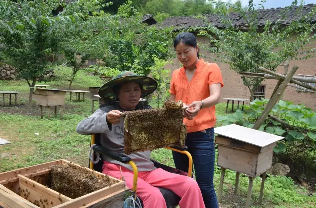 每天早晨,谢七妹都要用双手转动着轮椅去门前看望蜜蜂,检查蜜蜂前一天的采蜜情况。她说,在冬春季节,要注意做好蜂箱的保温工作,防止蜜蜂被冻死;夏季天气炎热,要注意防暑降温,保持空气流通,平时还要注意预防蜜蜂的天敌……一年之中,采蜜时节是她和丈夫最高兴的时候,虽然每次采蜜都是丈夫在忙,但看着丈夫在抖蜂、摇蜜、取蜜,她的心里就特别甜。去年,谢七妹一家在王美兰的帮助下,还被列入了造福工程搬迁对象,在村里的造福工程集中安置点建起了落地面积74.8平方米的新房。